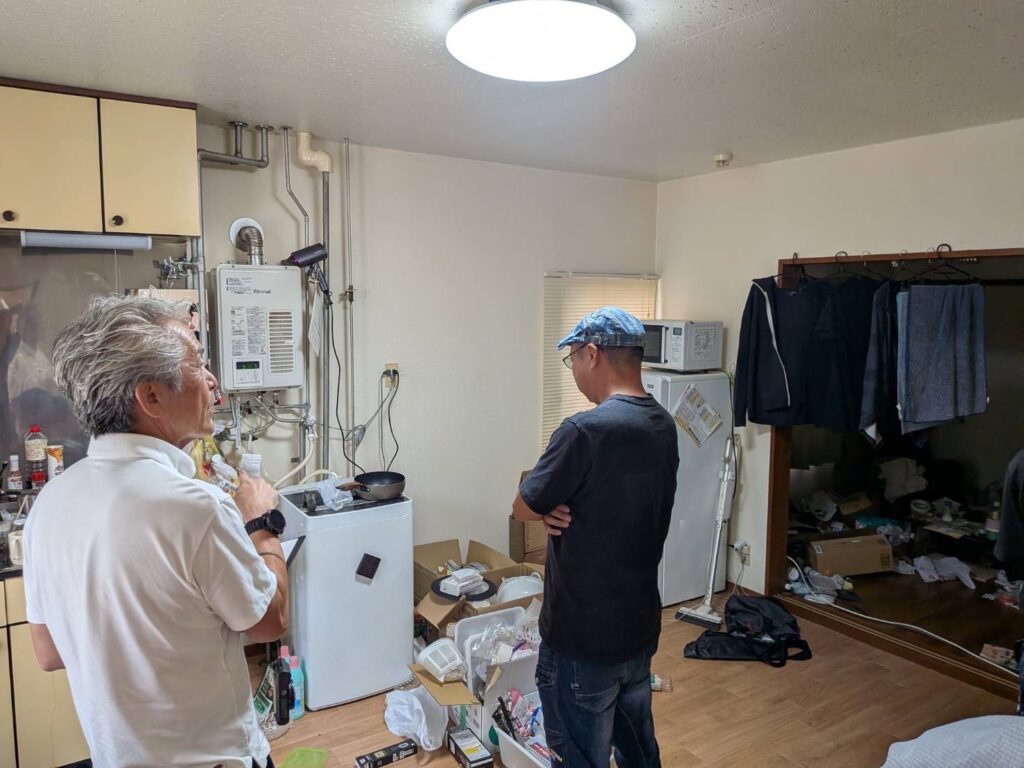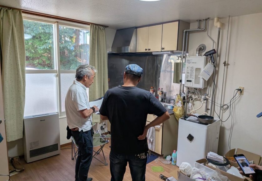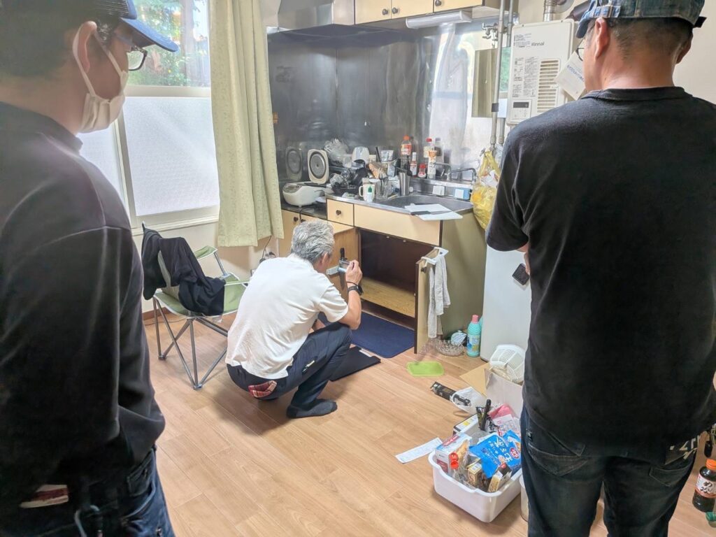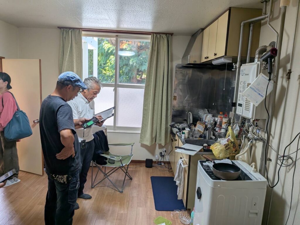 懐中電灯で床下を覗き込み、メジャーで寸法を測り、過去の修繕履歴や水回りの使い方まで確認していきます。