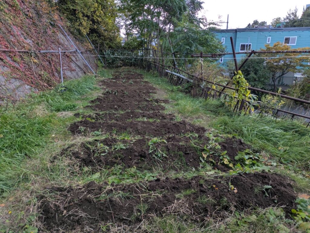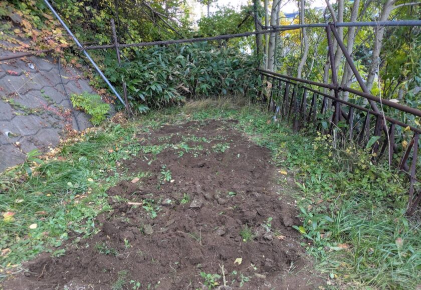 枯れた茎を抜き、支柱を片づけ、土をならして一年の締めくくり。