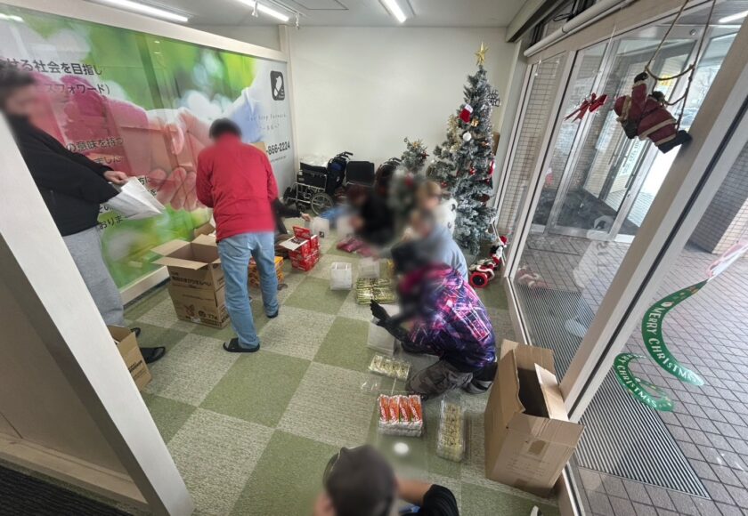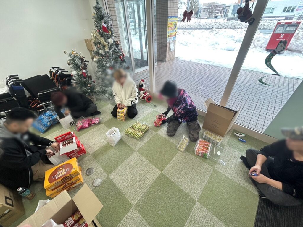 就労支援パルテでは、児童養護施設のクリスマス会で配布されるお菓子袋の作成作業を行いました。