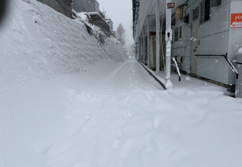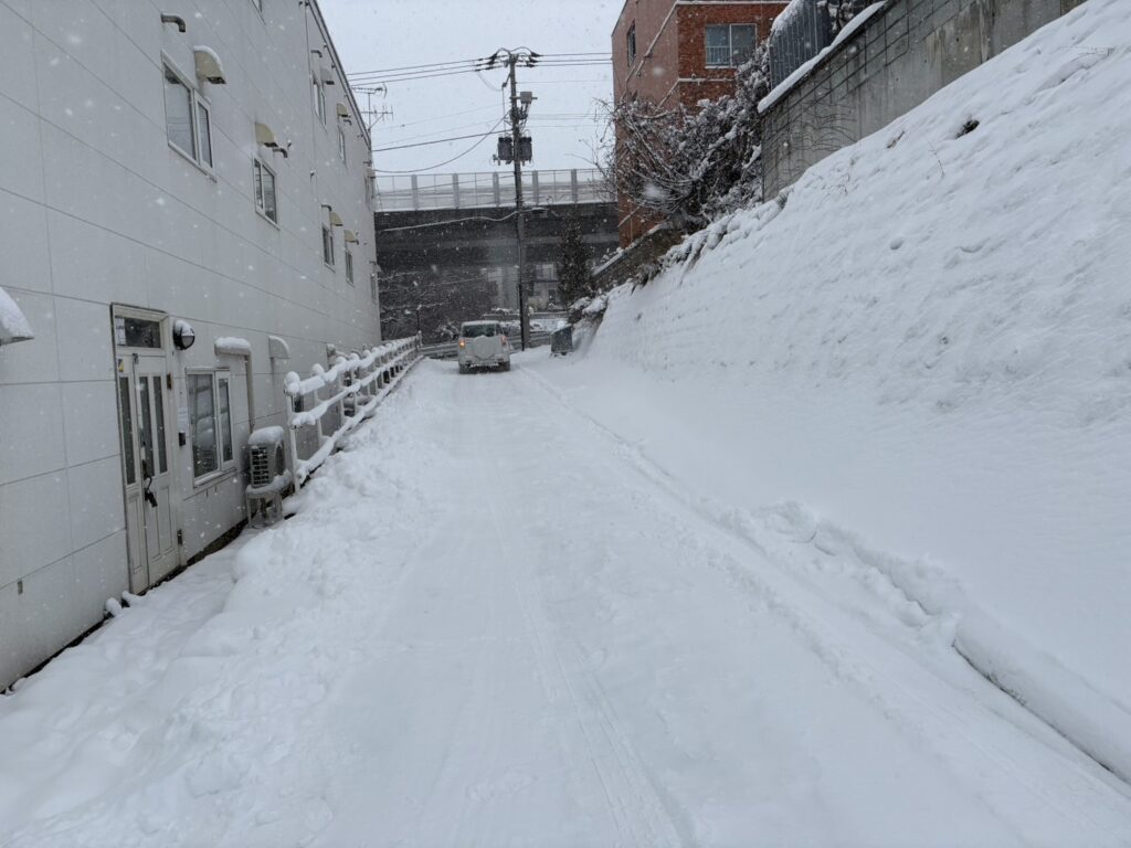数日前から降り続いた雪はしっかりと積もり、歩道や建物周辺は白一色の状態です。
