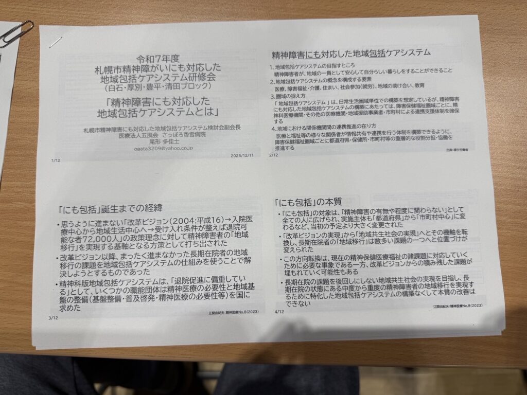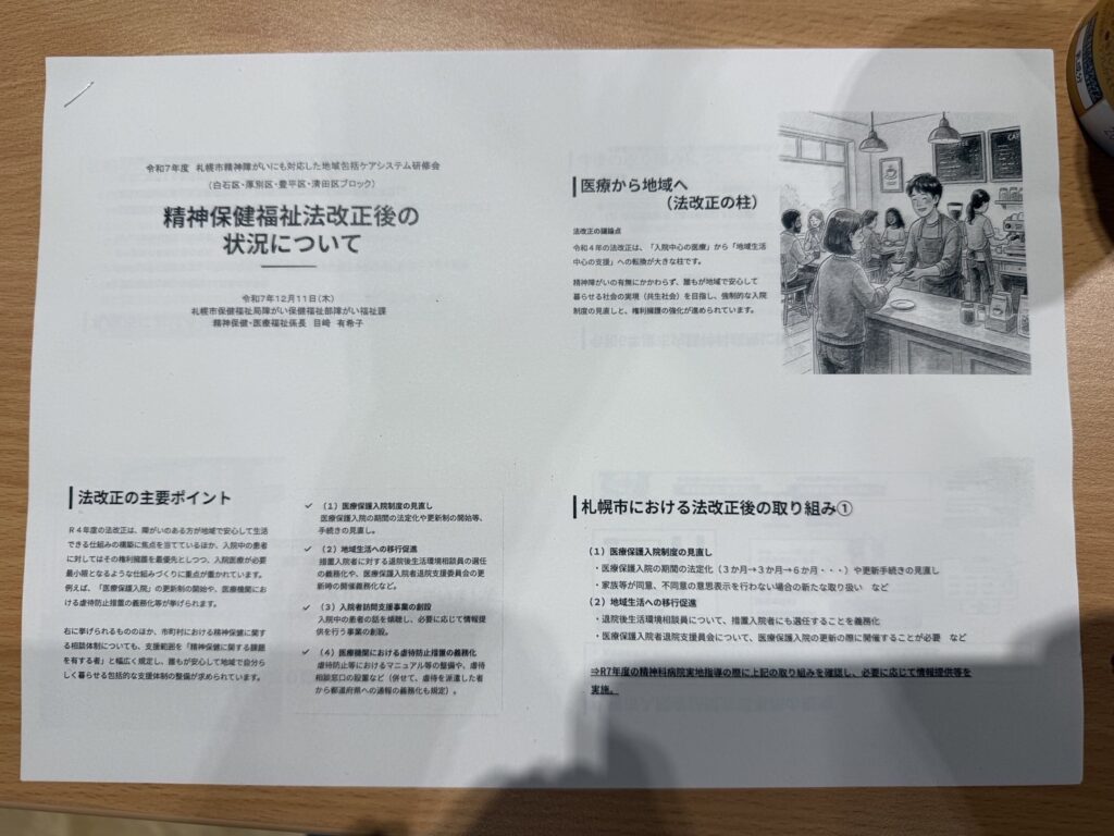 あわせて、札幌市精神障がいにも対応した地域包括ケアシステム検討会、ならびに研修会にも出席し、制度の背景や現場での実践について多くの学びを得る時間となりました。