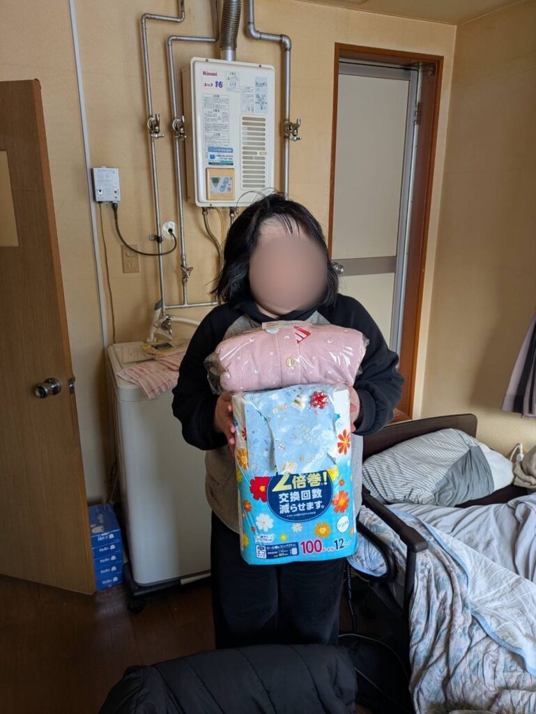 お誕生日当日、私たちから寒さを乗り切ってほしいという思いを込めて、暖かいカーディガンと生活用品のトイレットペーパーをプレゼントしました。