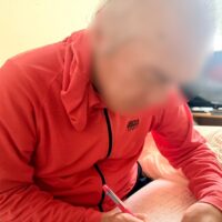 ひよこをそっと持ち上げ、新しい場所に置く瞬間の表情。