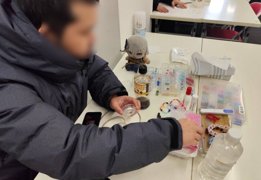 今回は、施設内で行われたビーズアクセサリー作成と薬袋作成の様子を紹介します。