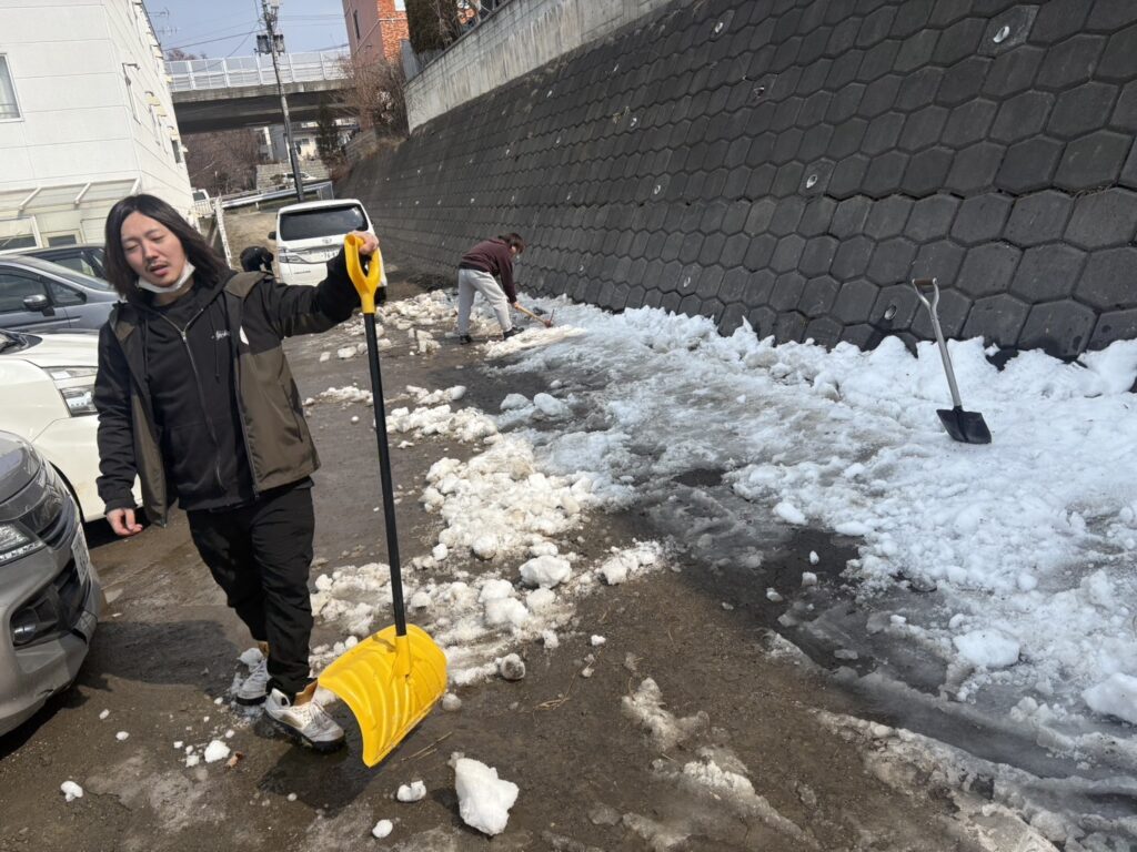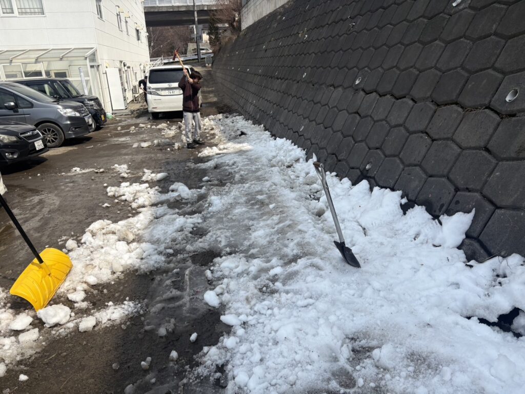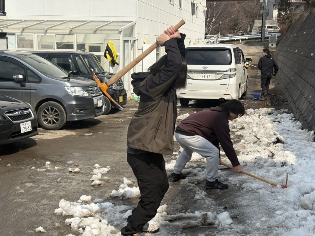 春を呼び込む一振りの力│駐車場に残る氷を割る雪割ボランティアの現場