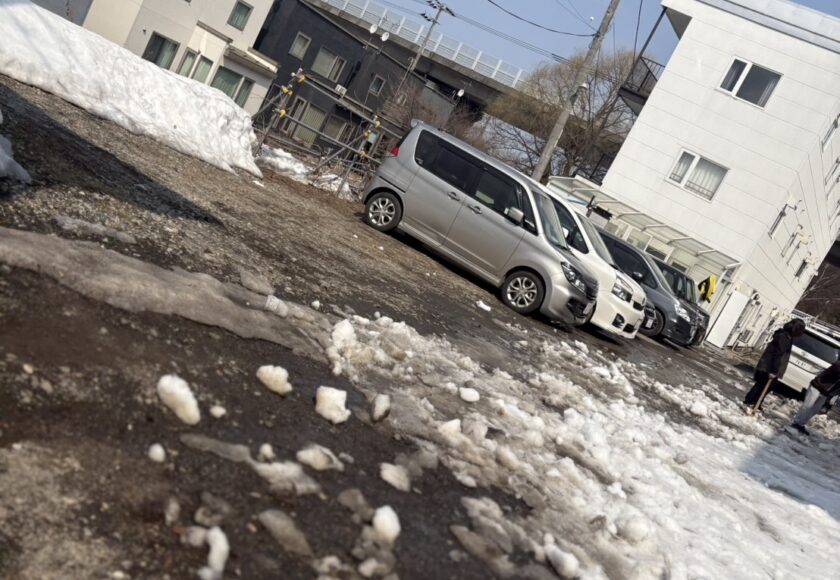 特に駐車場のように踏み固められた場所では、雪はやがて硬い氷となり、長くその場に残り続けます。