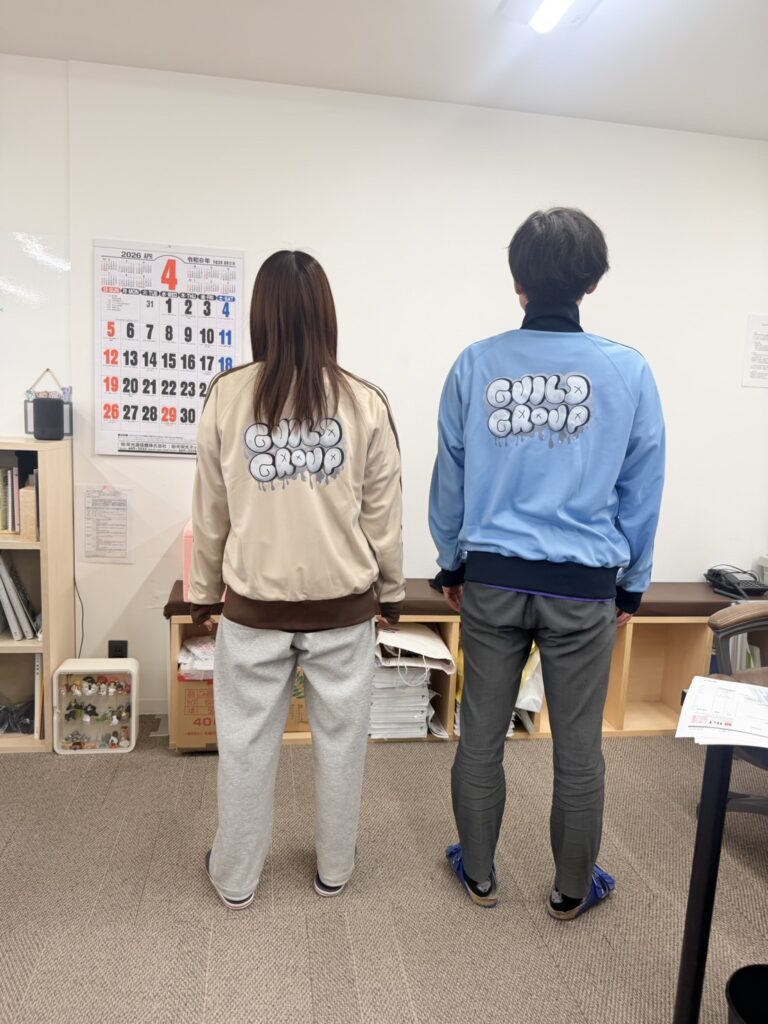背中にはポップなフォントで大きく「GUILDGROUP」の会社名がプリントされており、どこか遊び心を感じさせる仕上がりとなっています。