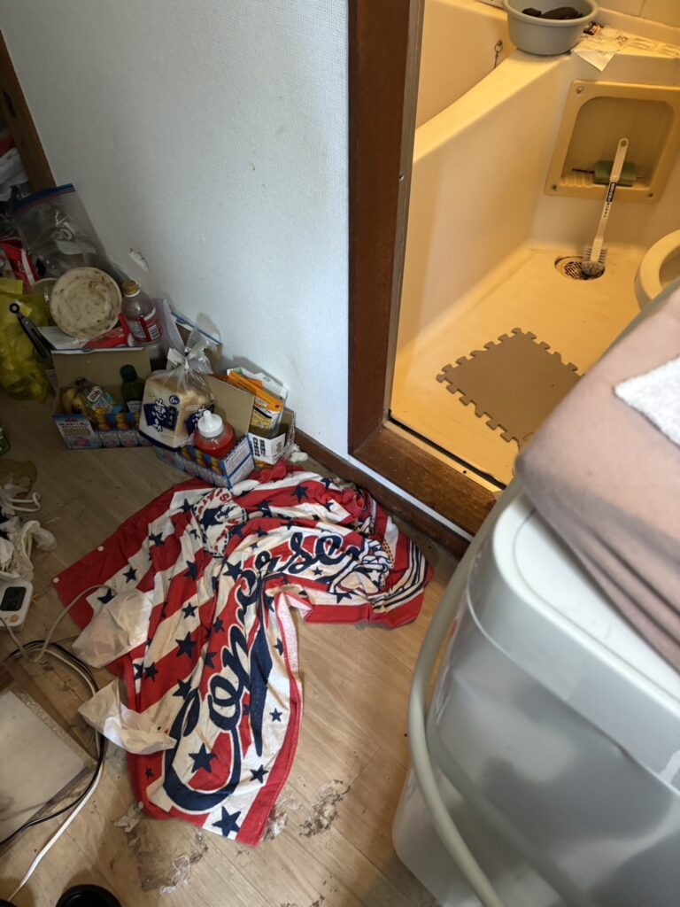 床を埋め尽くす空の酒瓶やコンビニ弁当の殻、そして足の踏み場もないほどに散乱した衣類。